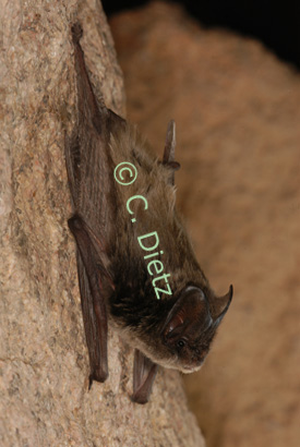 ist dieser Hautlappen sehr viel deutlicher ausgeprägt. Die Echoortungslaute der Sinai-Mopsfledermaus (rechts) sind in ihrer Struktur und dem Frequenzverlauf denen der Europäischen Mopsfledermaus sehr ähnlich, obwohl ein gänzlich anderes Habitat zur Jagd aufgesucht wird. |